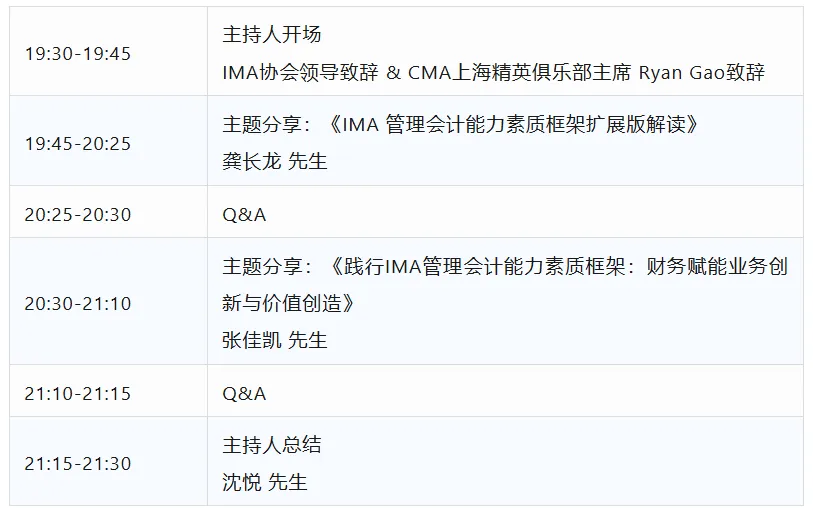 本次活动围绕《管理会计能力素质框架》(扩展版)与“财务赋能业务创新”两大主题,通过专家解读、案例分享与实践研讨,助力财管人士把握行业趋势,构建未来竞争力,在推动企业数字化转型与可持续发展中发挥关键作用。CMA上海精英俱乐部诚邀您共同探索财务人的进阶之路,共绘专业发展的新蓝图!