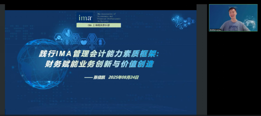 2025 年 8 月 24 日,CMA上海精英俱乐部以 “IMA 管理会计能力素质框架扩展版解析” 与 “财务赋能业务创新” 为核心主题,再次搭建高质量学习交流平台。活动采用线上形式,邀请多位行业专家倾情分享,近90位CMA注册管理会计师持证者积极参与。本次活动通过 “专家解读 + 案例分享 + 实践研讨”三位一体的丰富形式,助力财会专业人士精准把握行业趋势、系统构建未来竞争力,在推动企业数字化转型与可持续发展的进程中找准方向。活动现场互动频繁,线上交流反响热烈。