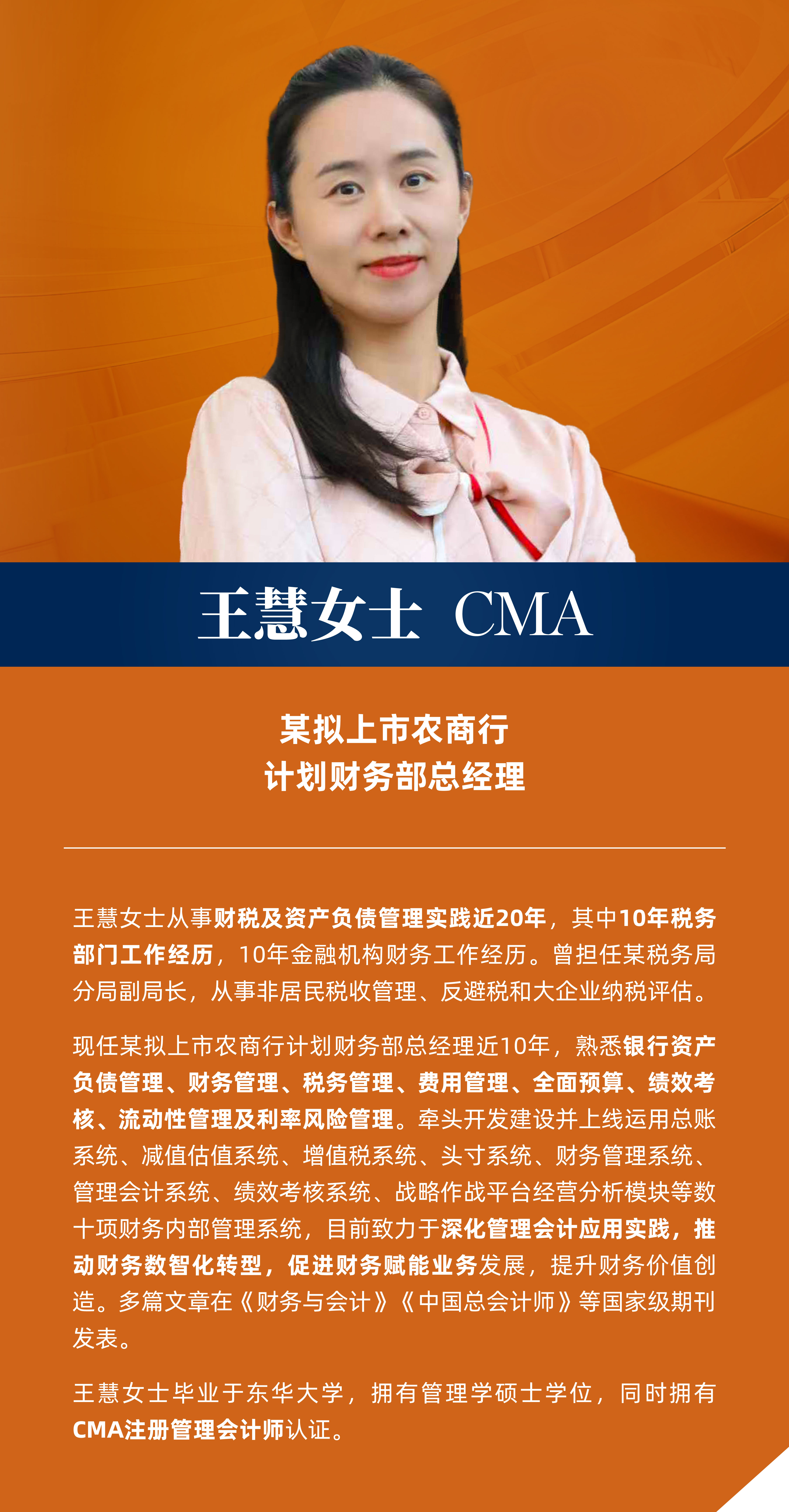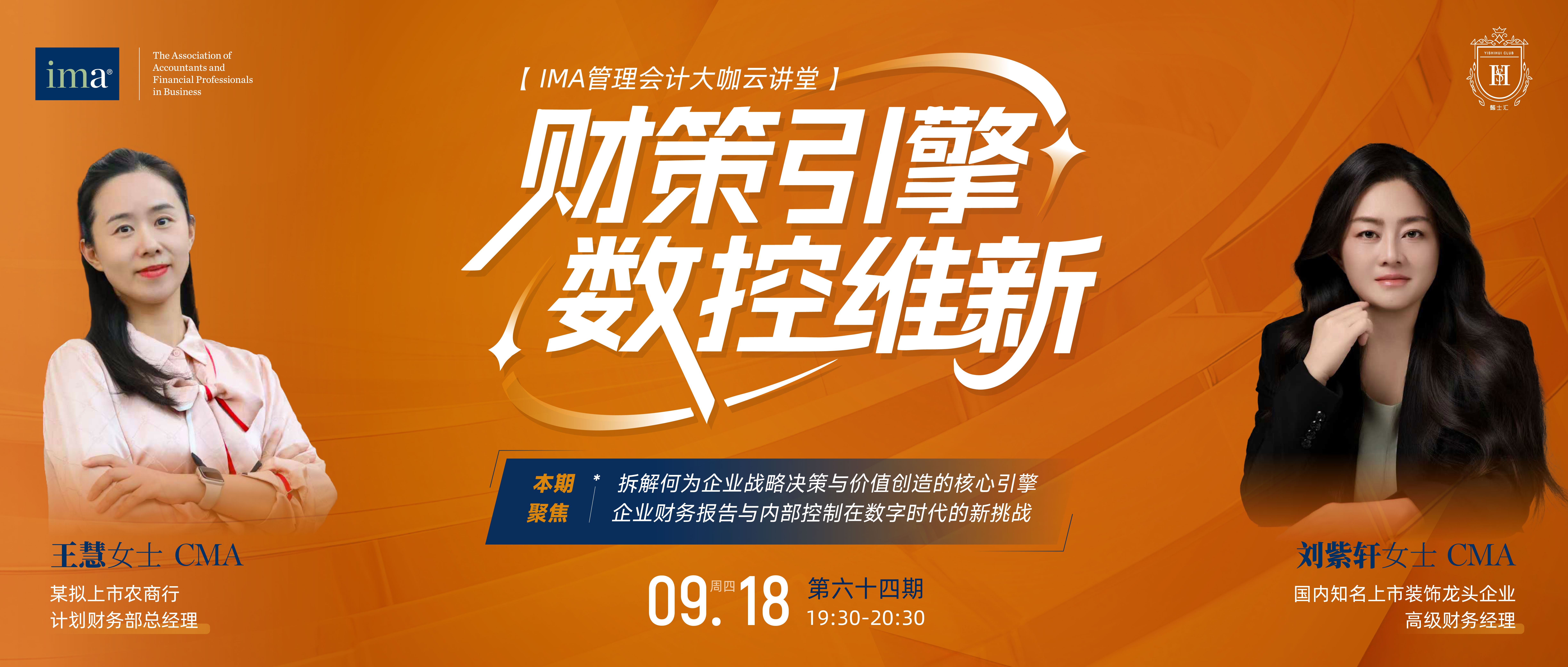第六十四期【IMA管理会计大咖云讲堂】栏目特邀两位优秀的业内嘉宾,同时也是优秀的CMA持证者,分别是来自某拟上市农商行计划财务部总经理王慧女士,以及来自国内知名上市装饰龙头企业高级财务经理刘紫轩女士,为大家带来主题为超越数字:CMA如何成为企业战略决策与价值创造的“核心引擎”以及数字化转型下的财务报告重构与内部控制新挑战的精彩分享财策引擎、数控维新,更多精彩内容,期待您的关注与聆听!