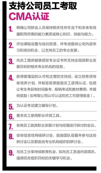 这一项目并未要求参与者取得专业证书,但强生公司财务高管鼓励他们这样做。此外,IMA员工会在财务培训课上介绍取得CMA认证的优势,而IMA会为员工提供带有自学指导的课程。强生公司承担了与CMA认证相关的费用,如教材费、考试费和成员年费,并对首个认证是CMA的员工给予现金奖励。