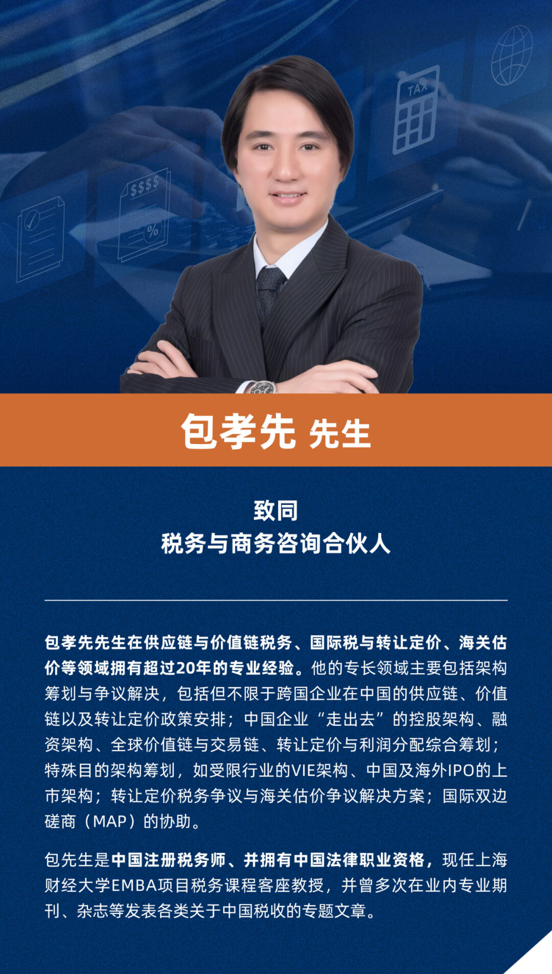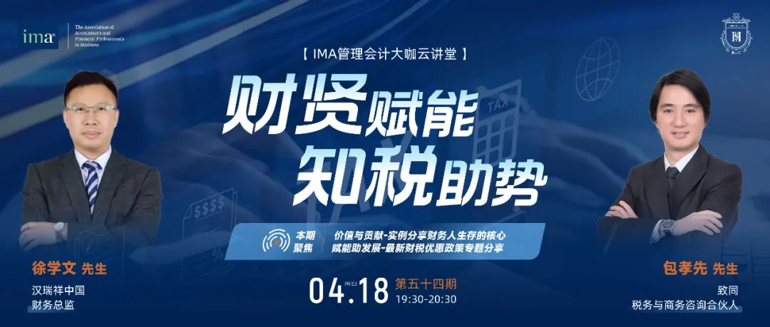 本期栏目特邀两位优秀的财界嘉宾,分别是来自汉瑞祥中国的财务总监徐学文先生以及致同税务与商务咨询合伙人包孝先先生,他们将从财务管理者职场突围以及财税政策专业视角为我们带来精彩的多维度分享。4月18日(周四晚间19:30)栏目准时上线,财贤赋能、知税助势,更多精彩44内容,期待您的关注与聆听!