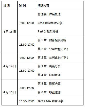 为鼓励和支持高校加强管理会计课程体系和师资队伍建设,加强管理会计专业方向建设和管理会计高端人才培养,不断优化管理会计人才培养模式,并响应教育部提出的在高等教育中加强职业化教育的政策,全方位营造管理会计职业化教育氛围,加强财经专业内涵建设,创新人才培养模式,大力提升师资水平和教学质量,推动管理会计人才培养。IMA管理会计师协会与IMA管理会计教育专家委员会定于2018年4月13日至4月15日在北京举办“高校管理会计CMA师资培训班”。