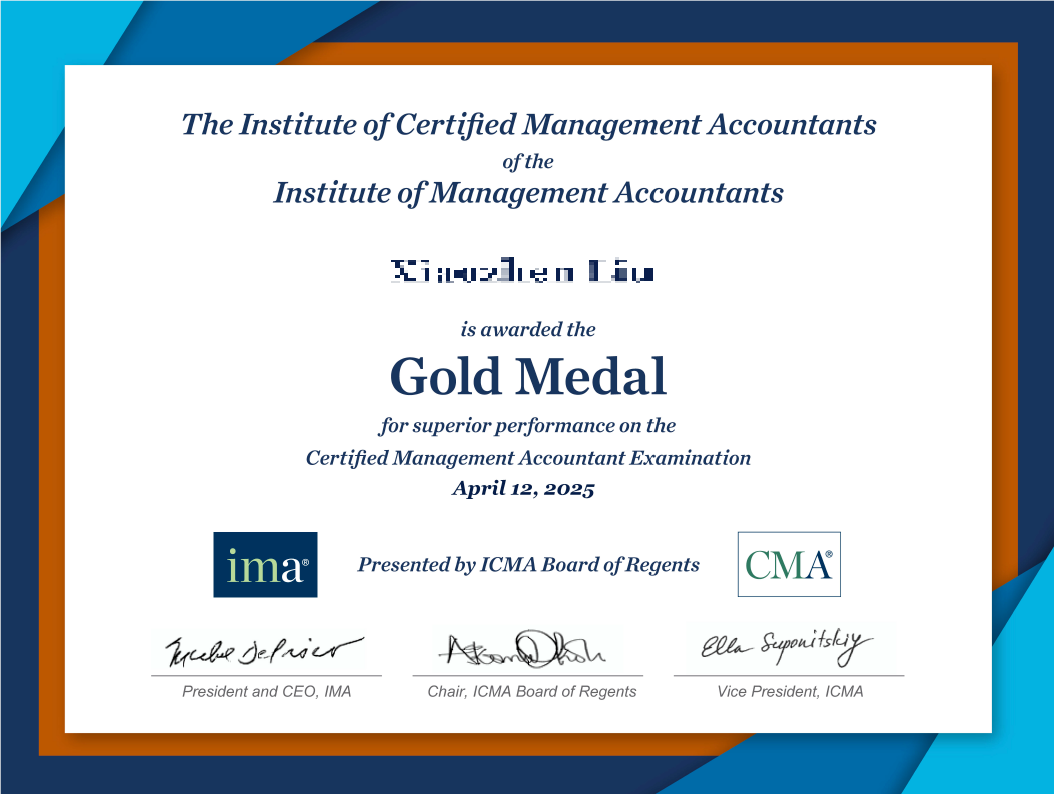 IMA管理会计师协会考试认证部日前公布了2025年4月举行的CMA注册管理会计师认证中文考试高分获奖者名单。