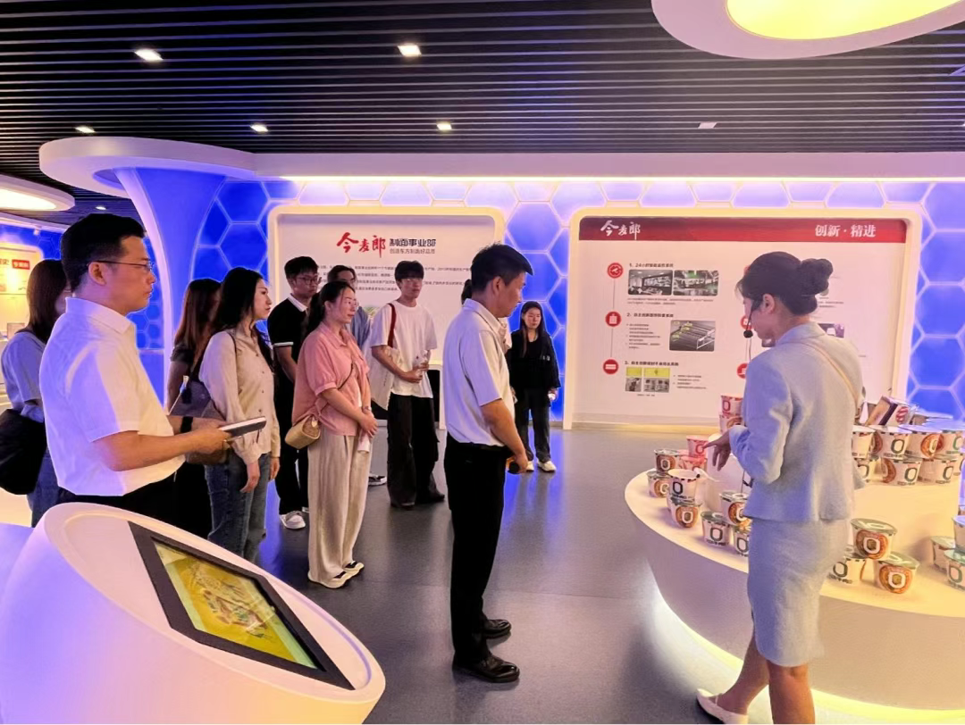 代表团首先参观了今麦郎印象馆,系统了解了企业发展历程、愿景文化及未来的战略规划。在会计部总监曾永安先生的带领下,师生实地考察了今麦郎方便面、饮品、挂面等产品生产车间,深入观摩现代化的生产设备、严格的品控管理体系和先进的技术研究中心。期间,代表团还品鉴了多种企业产品,并对其品质和口味给予高度评价。