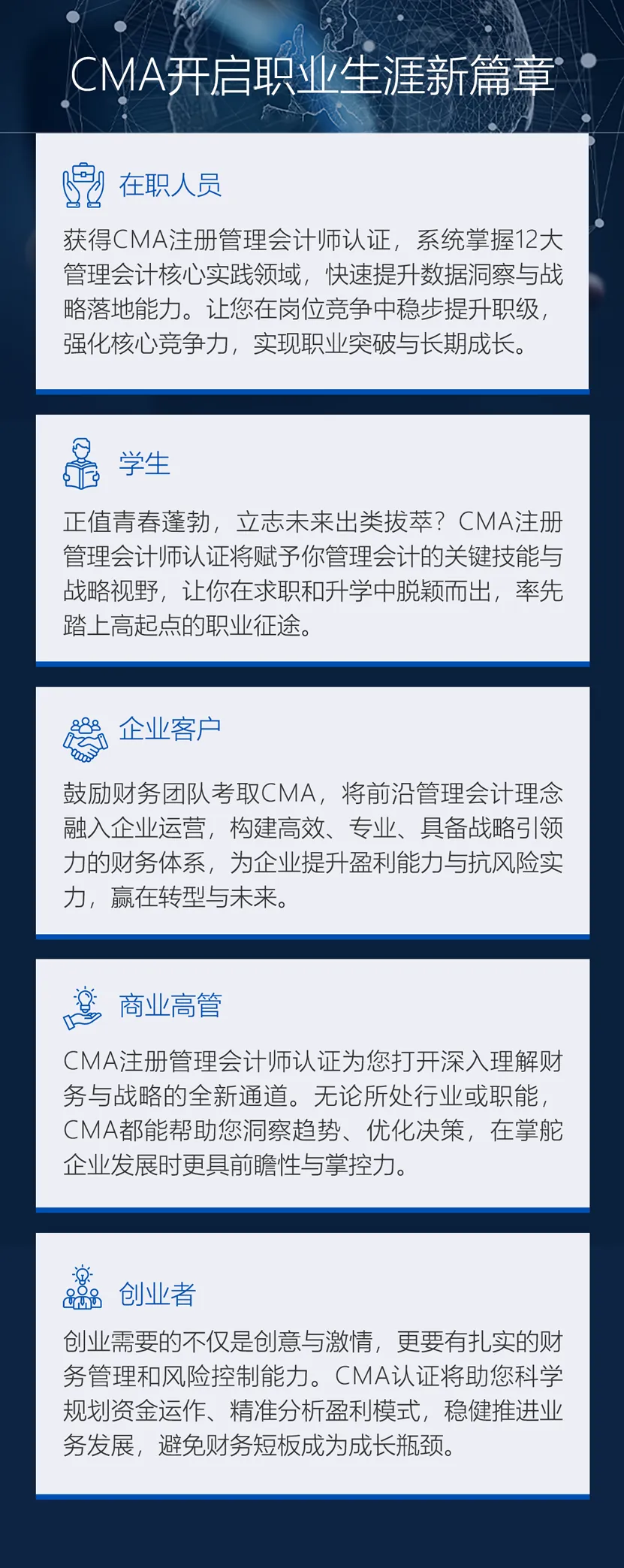 即刻启程,让CMA注册管理会计师认证成为重塑财务认知边界的引擎与支点。它不仅涵盖战略财务、绩效管理、风险控制等核心专业能力,更与时俱进地融入新兴技术、商业运营、数据分析与可持续发展等跨学科内容,系统赋能财务人成为业务共创者与组织战略合作者。