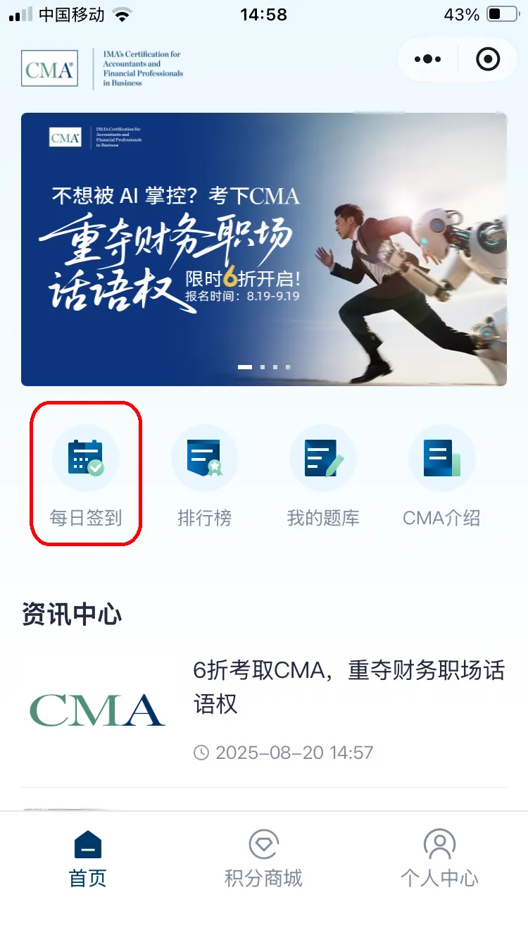 为了鼓励更多考生在 CMA限时6折优惠报名期间,抓住备考良机,IMA特别推出 “每日小测打卡有礼”活动”。