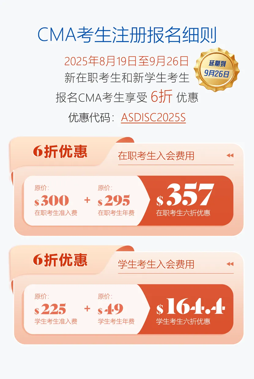 为助力财务专业人士深入学习管理会计,提升职场竞争力并拓展优质人脉,IMA协会特别推出限时福利“不想被AI掌控?考下CMA,重夺财务职场话语权!”活动仅剩最后2,000个名额,截止日期延长至9月26日。新在职及新学生考生可享准入费与考生年费6折优惠,补考考试费7折优惠(新老考生不限,规则见下图)。名额有限,报满即止,请尽快报名,切勿错过最后机会!