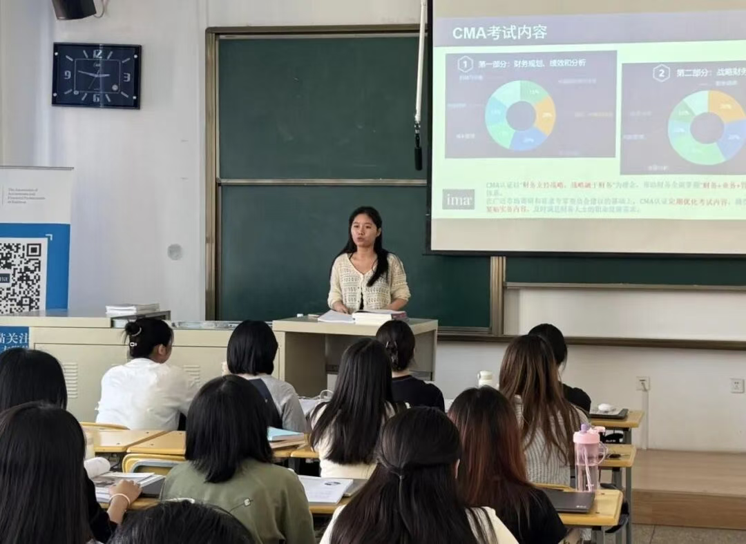 分享会伊始,张巧良教授围绕CMA行业认可度、考试政策及知识体系等内容作了系统介绍。她提到,持有CMA证书在提升个人核心竞争力、拓宽职业发展道路方面具有一定优势,同学们应积极关注行业发展趋势,提早规划,将学历教育与权威认证相结合,为未来高质量就业和职业生涯发展奠定基础。