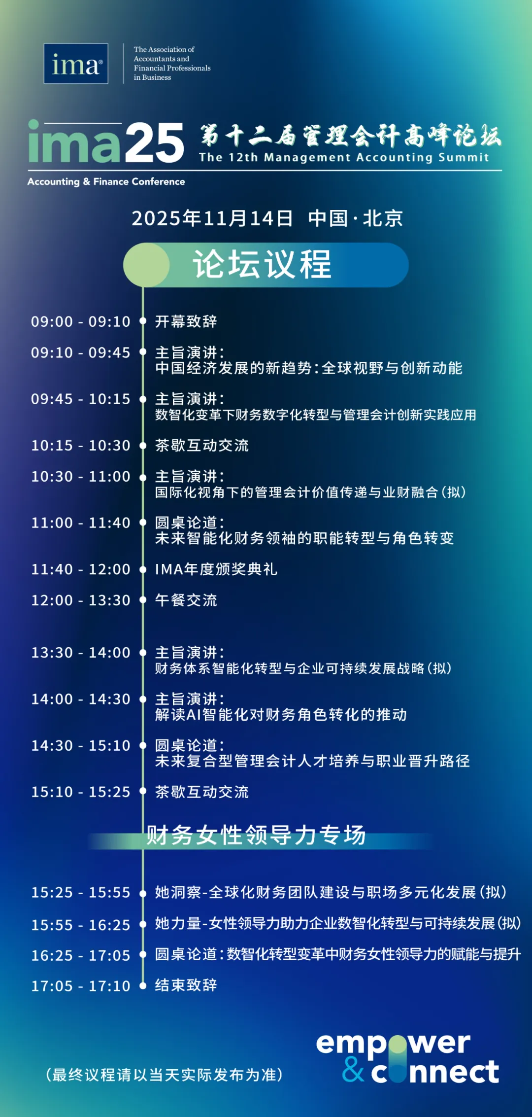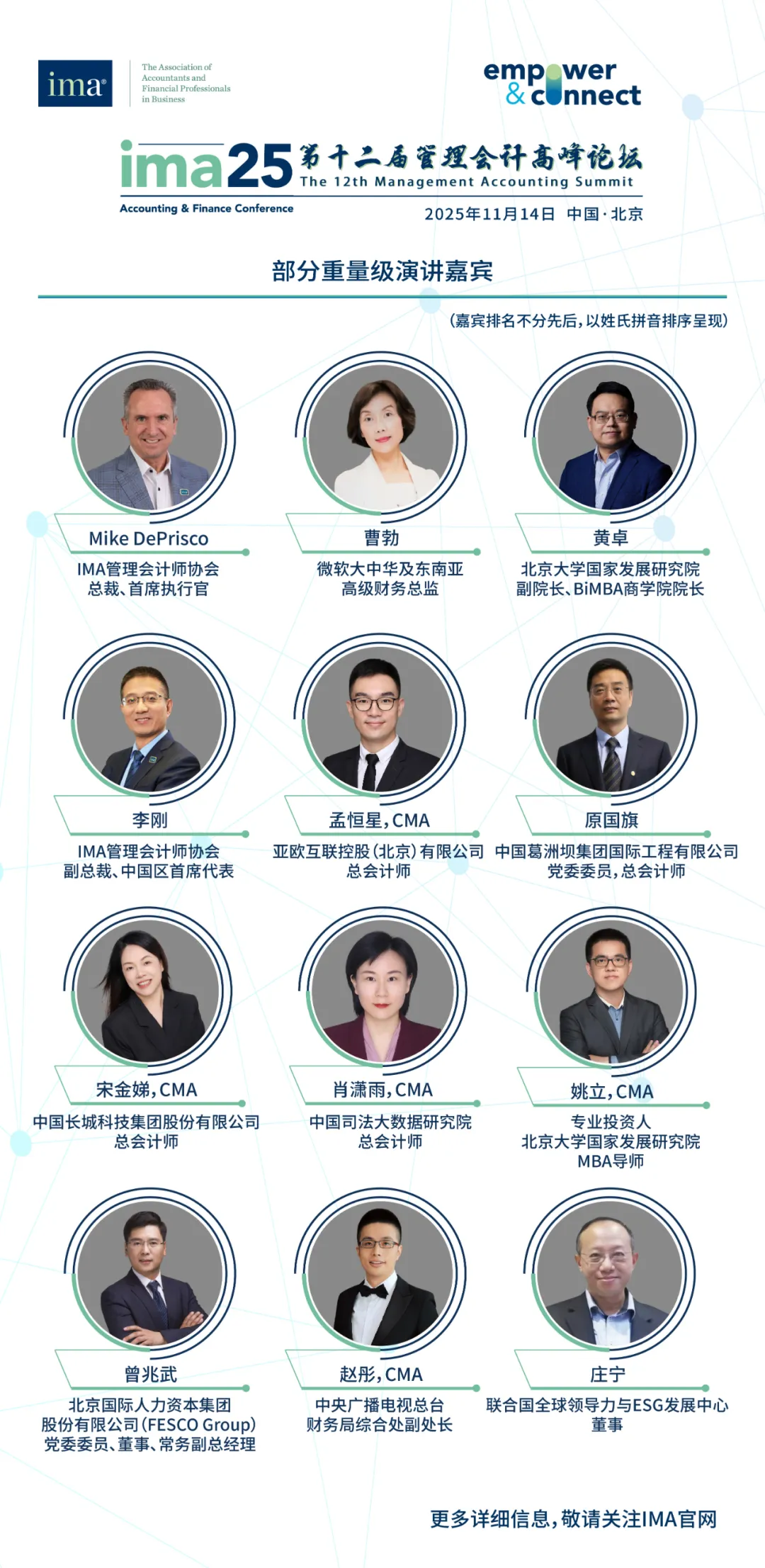 为助推管理会计前沿领域的研究和实施落地,更好地为企业和社会发展创造价值,由IMA 管理会计师协会举办的“第十二届管理会计高峰论坛”将于 2025年 11 月 14日(周五)在北京隆重拉开帷幕。