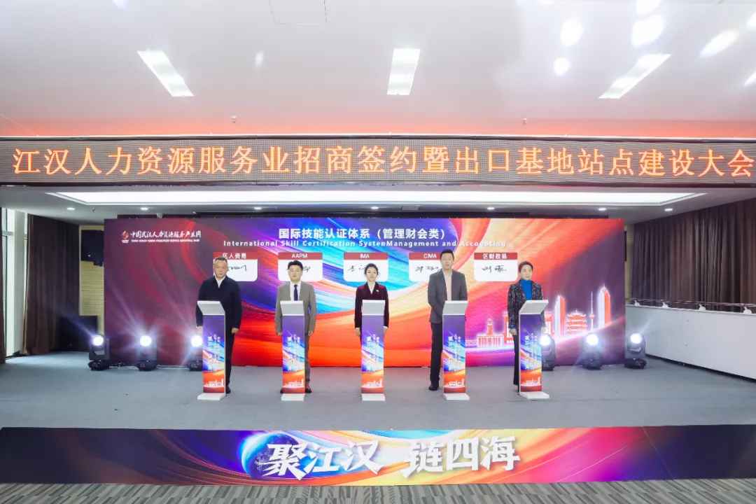 2025年10月28日,在武汉江汉区举办的“聚江汉·链四海”人力资源服务业招商签约暨出口基地站点建设大会成功举办。江汉区委副书记、区长郭小平,区委常委、区委组织部部长姜辉,副区长张隽波、任恒丽出席活动并与重点企业及IMA管理会计师协会等国际机构会谈交流。