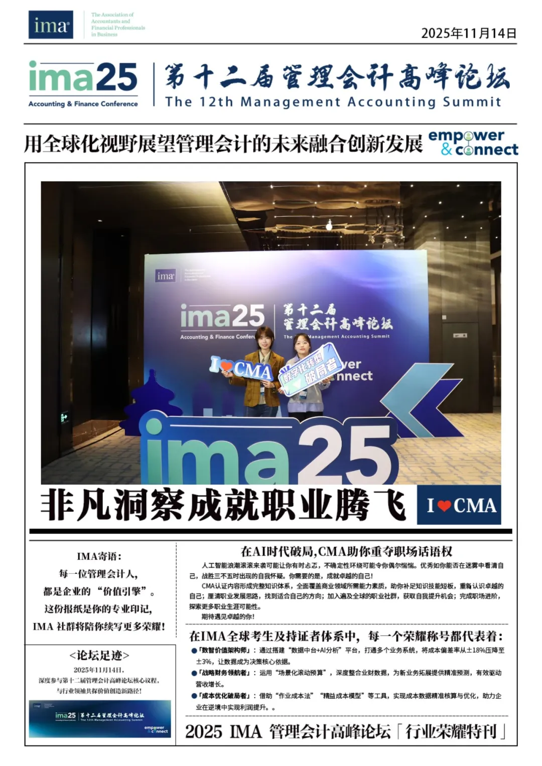 2025年11月14日,IMA 管理会计师协会在北京召开了IMA第十二届管理会计高峰论坛。其主要围绕着,在数智化与可持续发展的浪潮下,会计财务类人才该如何适应时代脚步,从传统的价值记录与守护者,全面升级为驱动企业创新、构建新质生产力、引领ESG战略的价值创造者。此次高峰论坛聚集了各行各业的资深行业学者,教授,投资人,企业总会计师,及IMA协会中国地区代表等行业大咖们莅临参加。