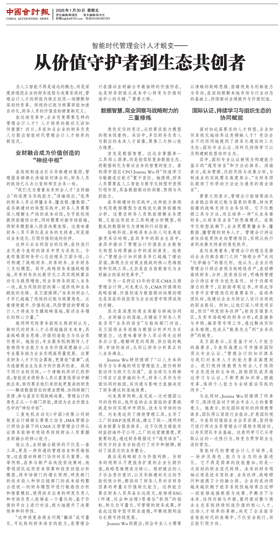 2026年1月30日,《中国会计报》管理会计版刊发深度报道《智能时代管理会计人才蜕变——从价值守护者到生态共创者》。文章指出,在人工智能深度赋能财务流程的当下,管理会计人才的职能内核正经历深刻变革,其角色已从传统的记账核算,加速向业财融合的“神经中枢” 和商业生态的共创者跃迁。