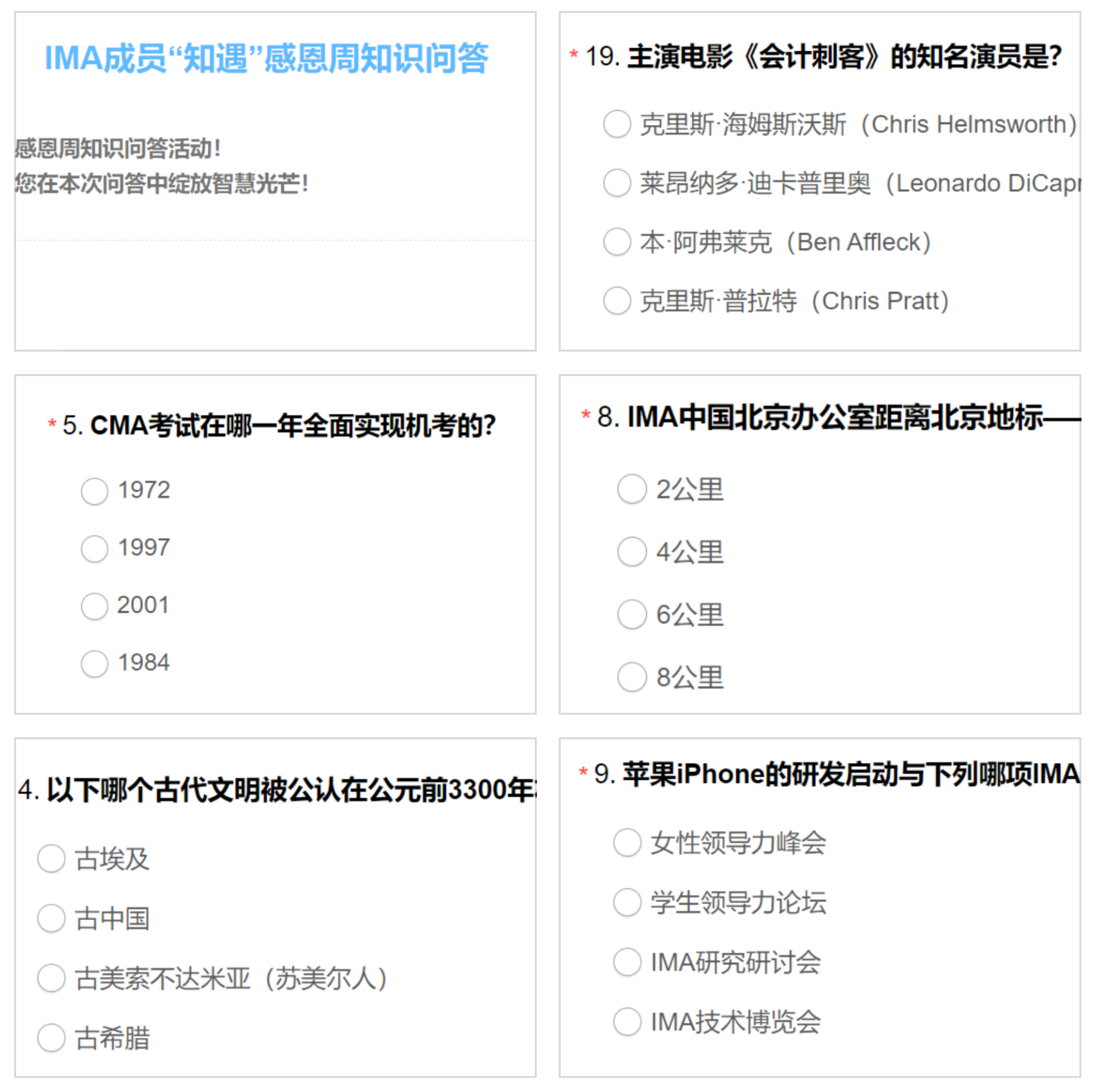 1. “3分钟知识调查挑战赛” :通过线上问卷形式,设置关于IMA协会发展、CMA全球影响力、成员权益及趣味冷知识的题目。活动结束后,将按得分高低及答题时间评选出前50名优胜者,每人可获得一份内含精美办公好物、品牌周边及限定纪念品的 “IMA大礼盒盲盒” 。
